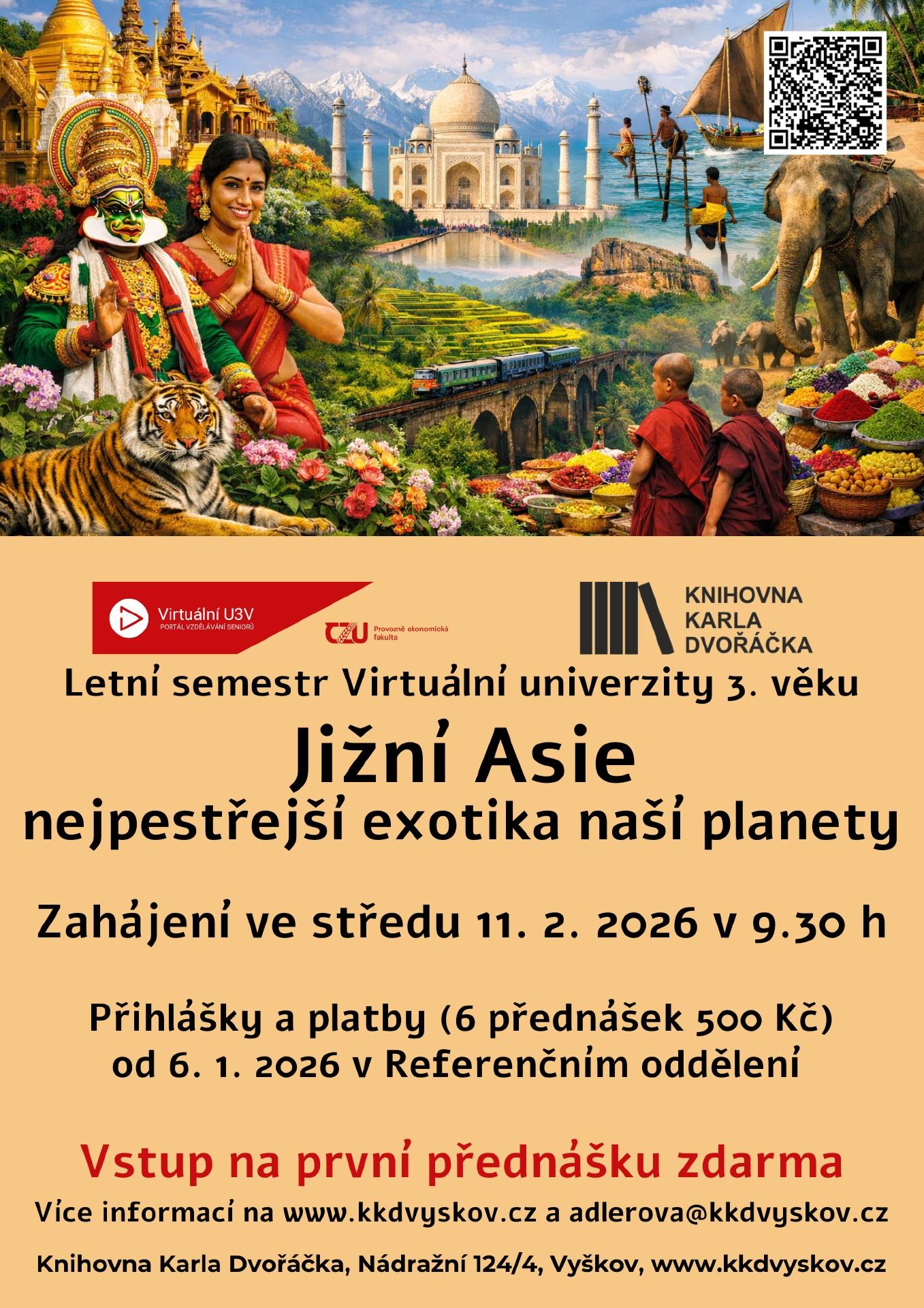 Vydejte se s námi na dobrodružnou cestu do jedné z nejbarevnějších a nejrozmanitějších oblastí světa. Jižní Asie nabízí dech beroucí přírodní scenérie a starobylé kultury. V šesti přednáškách poznáte tropické pralesy, zasněžené vrcholy Himálaje, země na rovníku, kouzelný Siam, životadárný Mekong i největší souostroví naší planety. RNDr. Aleš Krejčí, CSc. vás zavede od mystiky posvátných hor až po pulzující tropické moře. Přihlášky a platby (6 přednášek 500 Kč) přijímáme pouze osobně v referenčním odd. KKD. Vstup na první přednášku zdarma.