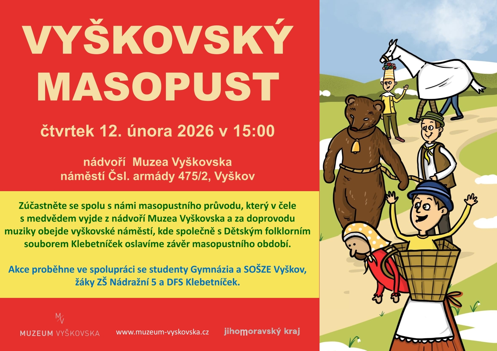 Zúčastněte se spolu s námi masopustního průvodu, který v čele s medvědem vyjde ve čtvrtek 12. února 2026 v 15 hodin z nádvoří Muzea Vyškovska a za doprovodu muziky obejde vyškovské náměstí, kde společně s Dětským folklorním souborem Klebetníček oslavíme závěr masopustního období.
