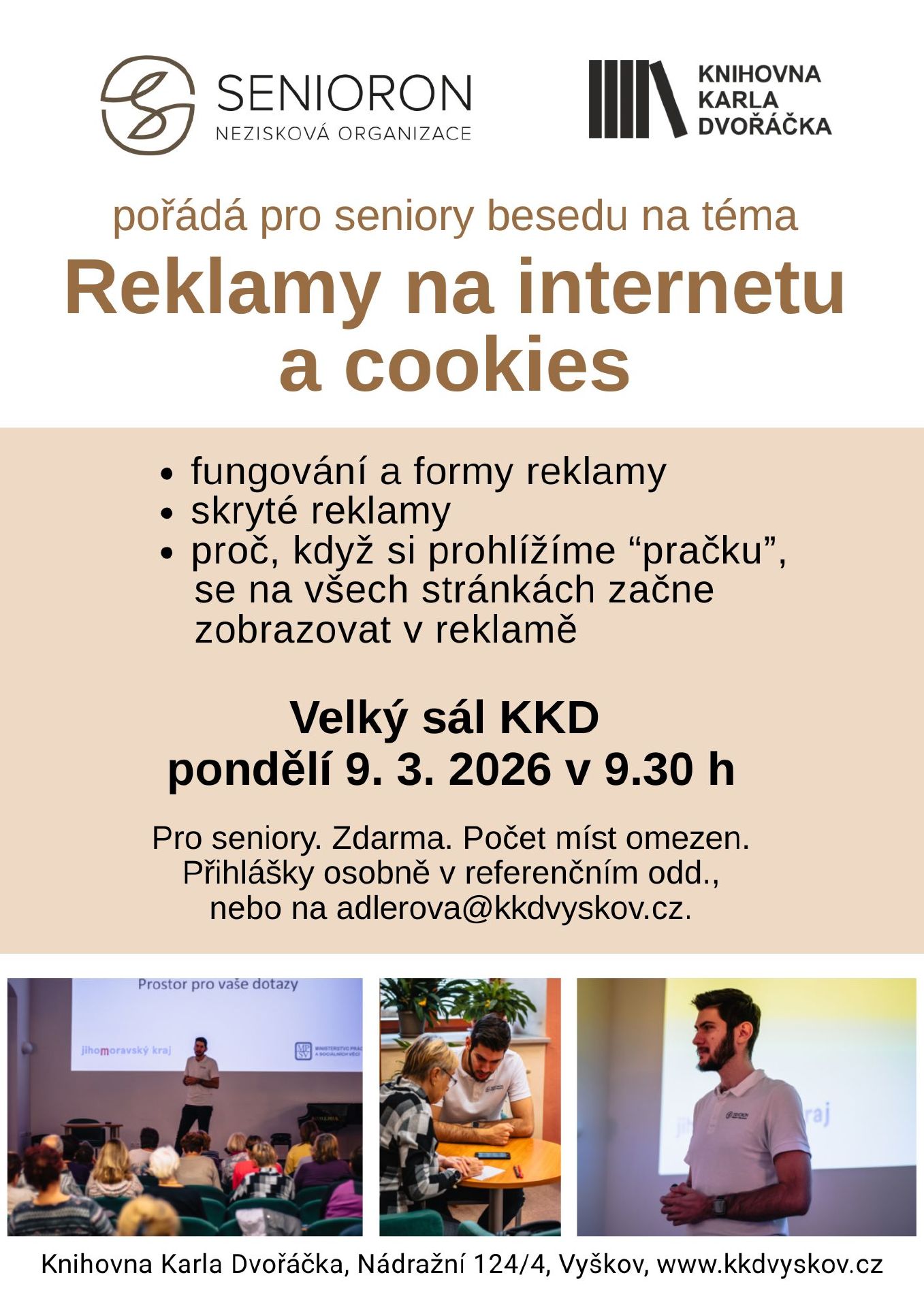 Beseda se zabývá fungováním reklamy a s jakými formami reklam se můžeme na internetu setkat. Povíme si, že reklama může být velmi často i skrytá a také si vysvětlíme, proč když si prohlížíme “pračku”, tak se na všech stránkách začne zobrazovat v reklamě. Pro seniory. Zdarma. Počet míst omezen. Ve spolupráci s SeniorOn, z.ú. Přihlášky osobně v knihovně, nebo na emailu adlerova@kkdvyskov.cz.