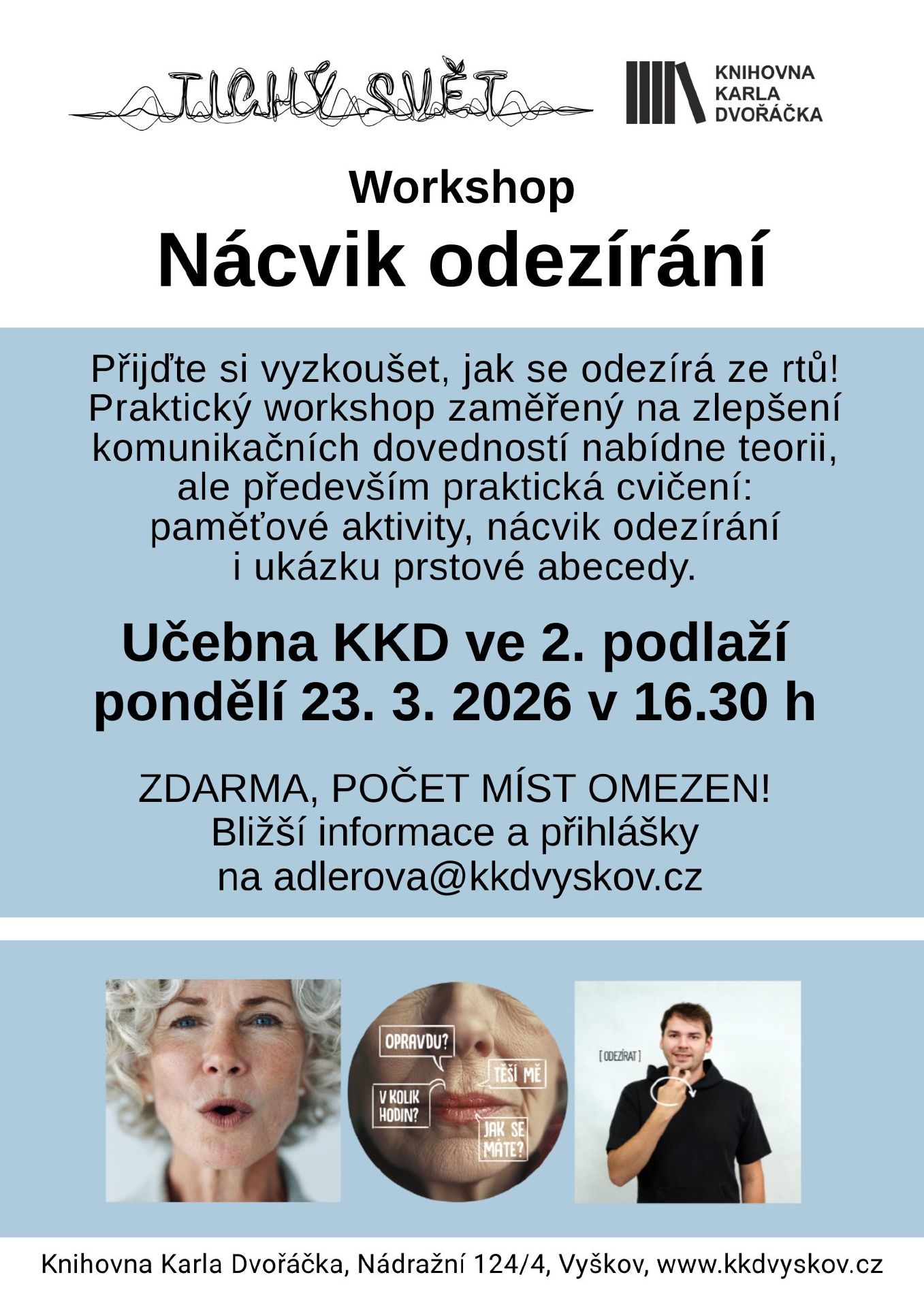 Přijďte si vyzkoušet, jak se odezírá ze rtů. Praktický workshop zaměřený na zlepšení komunikačních dovedností nabídne teorii, ale především praktická cvičení: paměťové aktivity, nácvik odezírání i ukázku prstové abecedy. Počet míst omezen! Přihlášky na adlerova@kkdvyskov.cz. Ve spolupráci s organizací Tichý svět.