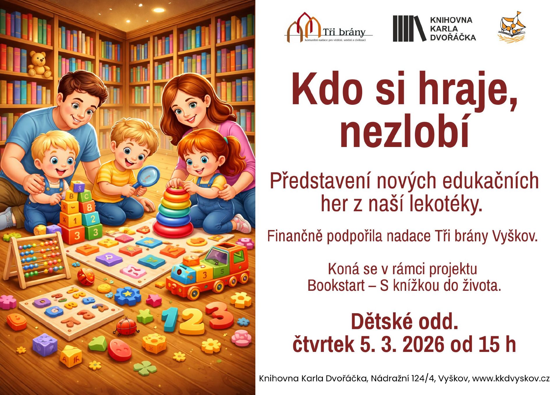 Představení nových edukačních her z naší lekotéky. Finančně podpořila nadace Tři brány Vyškov. Koná se v rámci projektu Bookstart – S knížkou do života.