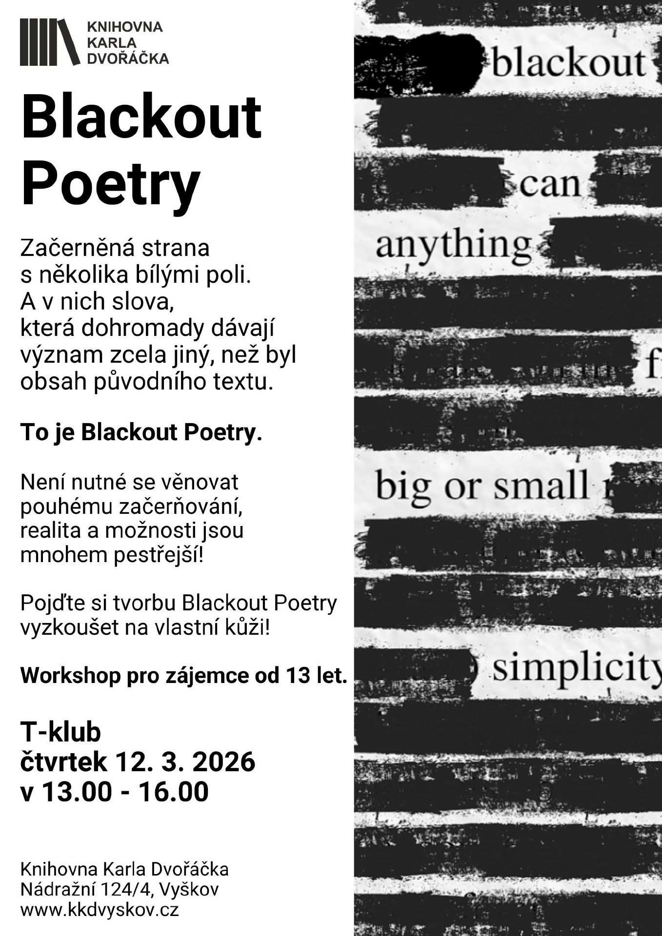 Začerněná strana s několika bílými poli. A v nich slova, která dohromady dávají význam zcela jiný, než byl obsah původního textu. To je Blackout Poetry. Vizuální poezie, která vzniká kreativní destrukcí. Není nutné se věnovat pouhému začerňování, realita a možnosti jsou mnohem pestřejší! Pojďte si tvorbu Blackout Poetry vyzkoušet pod vedením knihovníka. Od 13 let.