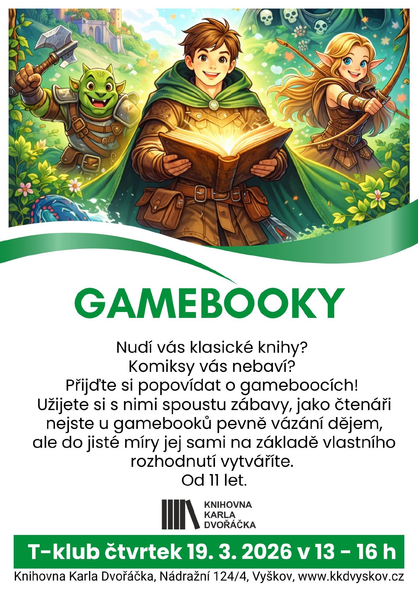 Nudí vás klasické knihy? Komiksy vás nebaví? Přijďte si popovídat o gameboocích! Užijete si s nimi spoustu zábavy, jako čtenáři totiž nejste u gamebooků pevně vázání dějem, ale do jisté míry jej sami na základě vlastního rozhodnutí vytváříte. Od 11 let.