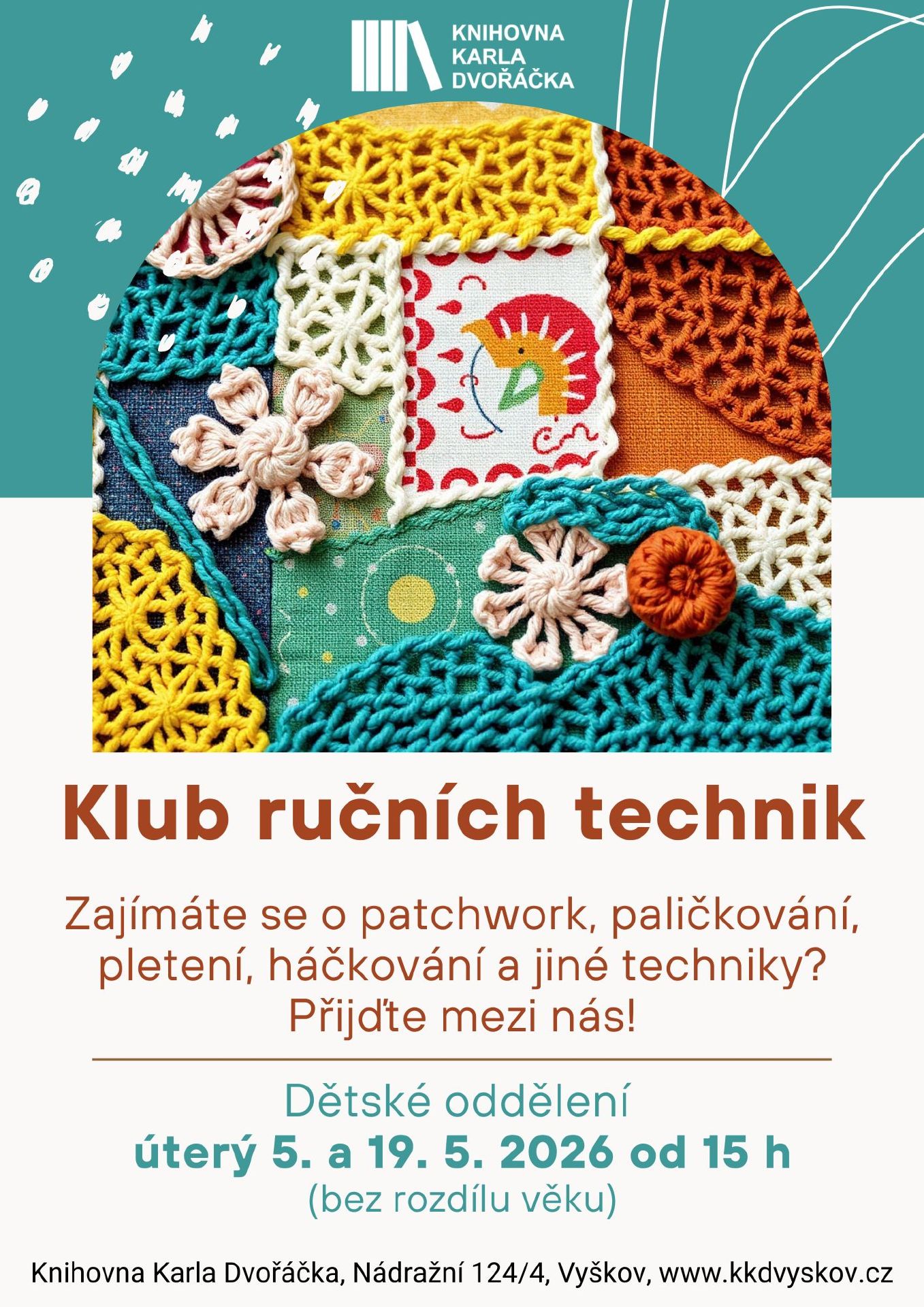 Zajímáte se o patchwork, pletení, háčkování, paličkování a jiné techniky? Přijďte mezi nás! Bez rozdílu věku.