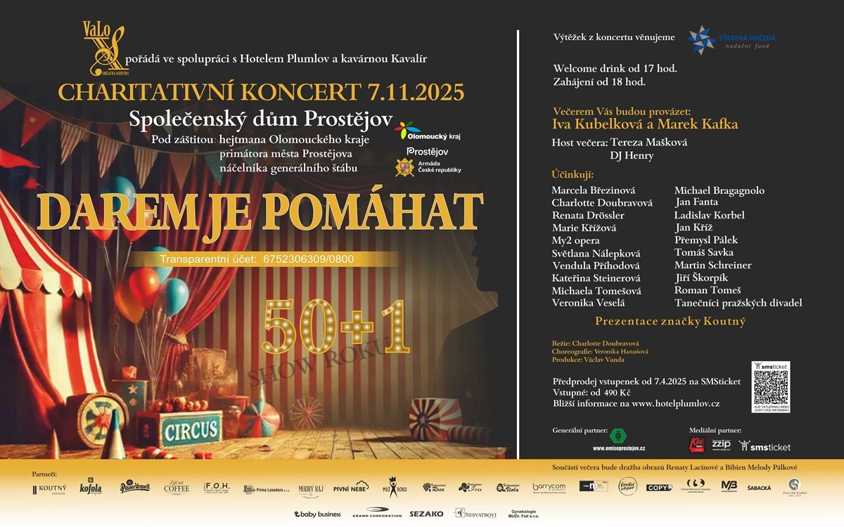 Výtěžek tohoto koncertu bude pro Téměř sedmiletou holčičku, která od narození čelí těžké cévní malformaci v centrálním mozku. Toto onemocnění vážně omezuje její pohyb a každodenní aktivity a vyžaduje neustálou péči. Bohužel v České republice není dostupná léčba, která by mohla její stav zlepšit. Jedinou nadějí je specializované pracoviště v Římě, kde je možné provést zákrok, který by mohl Eliščin život významně změnit a dát jí šanci na větší samostatnost a lepší kvalitu života.