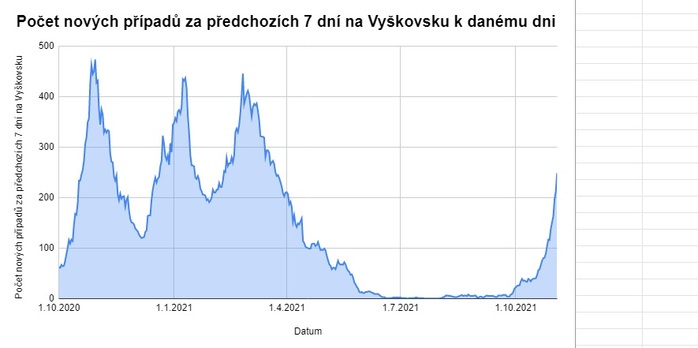 Na Vyškovsku začíná opět strmě růst počet nových případů onemocnění Covid-19 za posledních 7 dní. Po letní pauze tak situace nápadně připomíná počátek loňské podzimní nebo letošní zimní vlny, kdy se tyto počty v regionu začaly taktéž rapidně zvyšovat. Ještě v polovině letošního října bylo na Vyškovsku okolo čtyř desítek nových případů za poslední týden, ke 3. listopadu už toto číslo vzrostlo na 249.