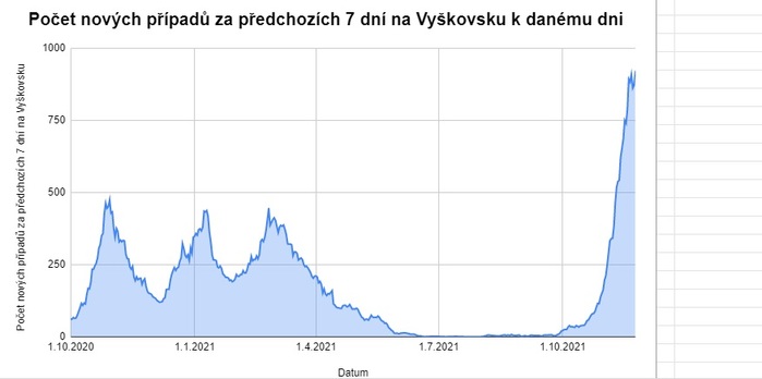 Následující graf shrnuje počet nových případů za posledních 7 dní na Vyškovsku od počátku března 2020, kdy se začala tato data počítat, do 24. listopadu 2021. Data vycházejí z otevřených datových sad Ministerstva zdravotnictví České republiky.