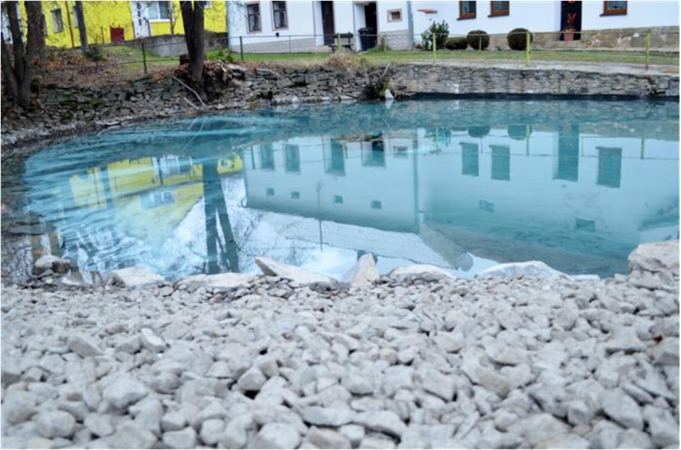 Malá vodní nádrž s rozměry přibližně 15 x 20 metrů zřejmě kdysi sloužila jako zdroj požární vody. V současnosti plní prakticky jen funkci estetickou. Její vznik není znám. V posledních zhruba dvaceti letech nicméně došlo vlivem opotřebení k několika kolizním situacím.
