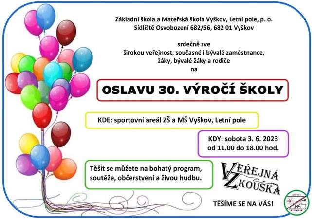 Ať jste žáci či rodičesoučasní, bývalí nebo budoucí, přátelé školy, kolemjdoucí či jen máte chuť se pobavit, přijďte 3. června na společnou oslavu výročí naší školy. Pro všechny návštěvníky bude v areálu školy připraven bohatý program – vystoupení žáků, občerstvení, sportovně se unavíme při „výročním maratonu“, malé děti zabavíme zajímavými aktivitami, poklábosíme, při prohlídkách školy si zavzpomínáte na vlastní školní léta a dozvíte se, co je u nás nového. Začínáme v 11.00 hodin a těšíme se na shledání s vámi.